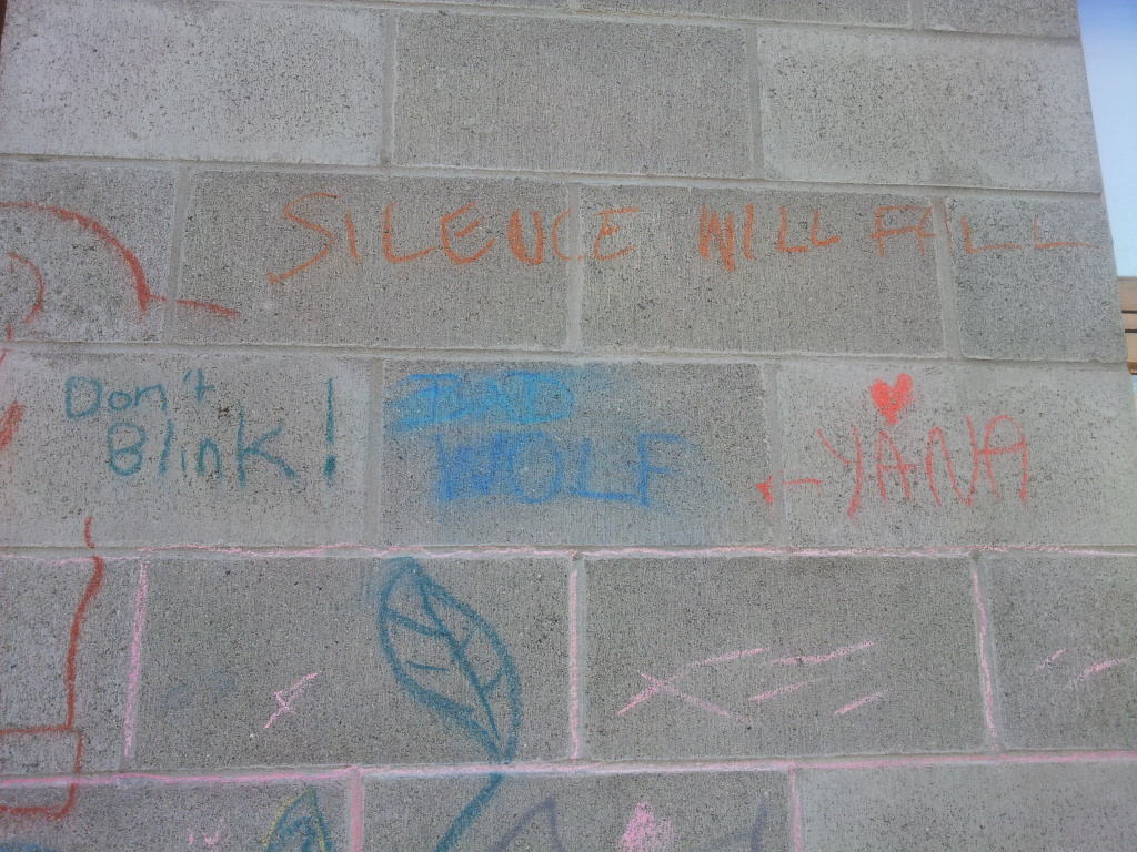 The Writers Fest is on Granville Island, which is probably my favorite place in Vancouver. I used to live there, ages ago, and it hasn’t changed much since then. It’s artsy and hippy and absolute hell to drive or park in. There are at least three independent coffee shops. There’s a Public Market. And there’s Arts Umbrella, which is where I spent a lot of time as a kid, taking classes in architecture, animation, pottery, jewelry-making, film, and other arts. While I was walking past Arts Umbrella on my way to Festival House on my first day, I noticed some chalk graffiti on the wall of the building. It was Doctor Who graffiti. I had a squee moment, and took a picture. The graffiti stayed up the whole week, so I got to show the real thing to my mom, too. (Then I convinced her to watch 6 episodes and finish off season 5 before she went up to Powell River this week.)